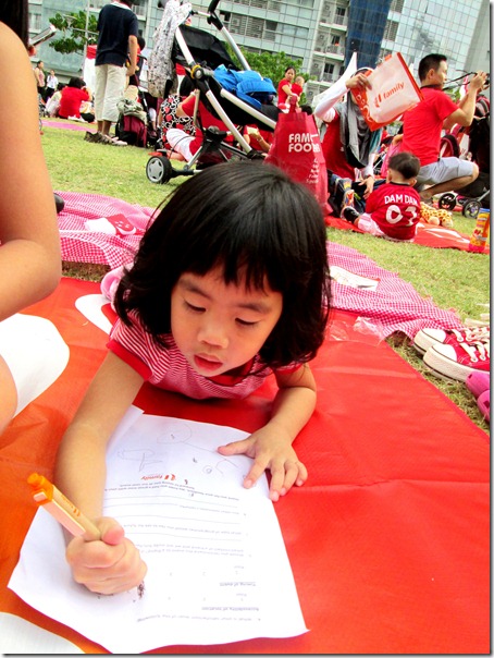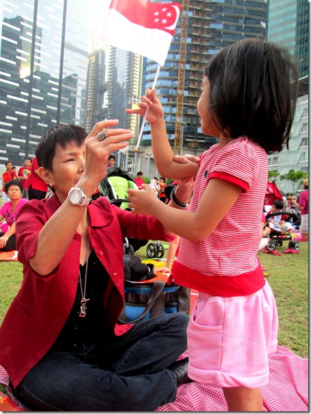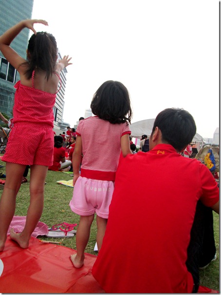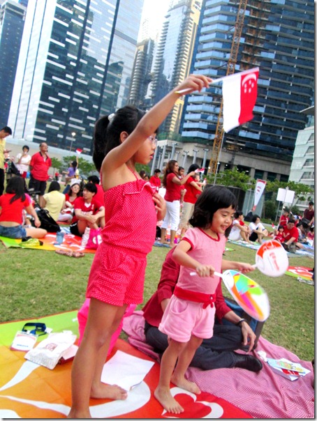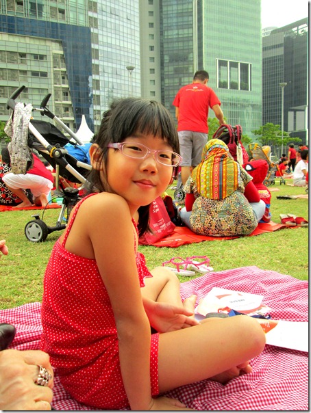 The whole family's dressed in RED for the event, and when we arrived, the whole lawn was already packed with a sea of red. The weather was windy and cool, so it was really quite nice lazing on the picnic mat while enjoying some family time together. We received a goody bag consisting of a picnic mat, fans and some miniature Singapore flags. We were getting into the NDP mood for sure!