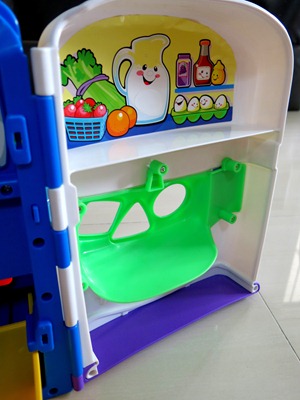 The Learning Kitchen is entertaining enough. Open the refrigerator door to see the light come on, learn about opposites, or hear a song. Inside the fridge, there's toy food and shape sorting fun for the kids to do. Flip the page on the flip book to hear about foods and learn about shapes and colours. On the other side of the kitchen, the kids can flip the light switch on and off, turn on the faucet, open the oven door, or roll the roller on the clock. A total of more than 15 songs and tunes can be played!