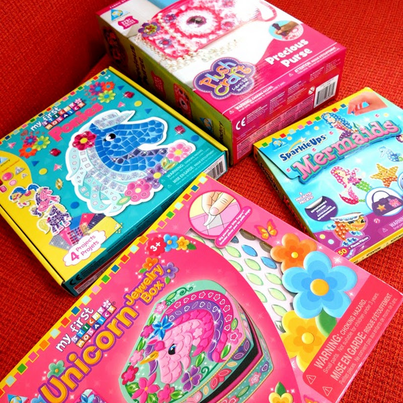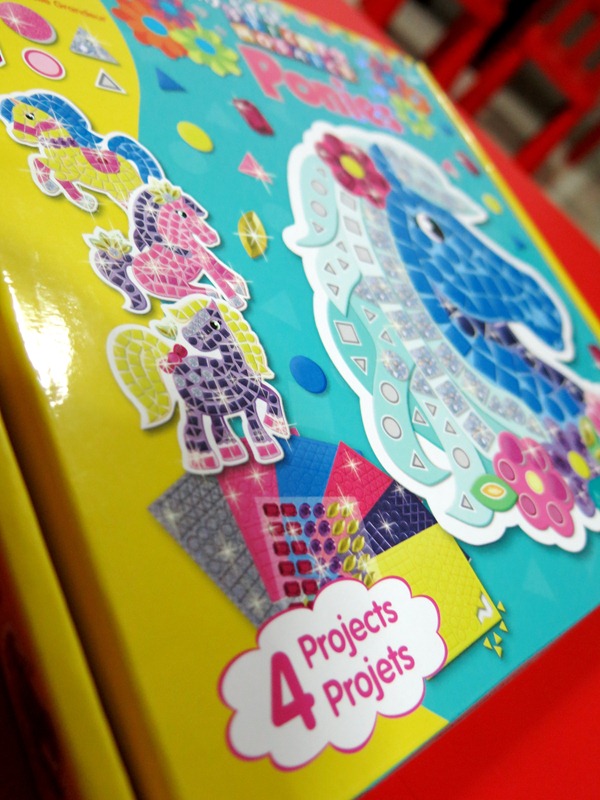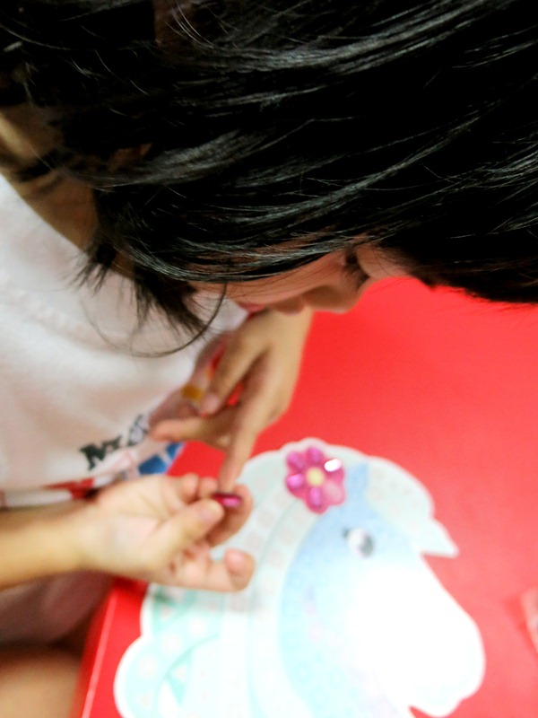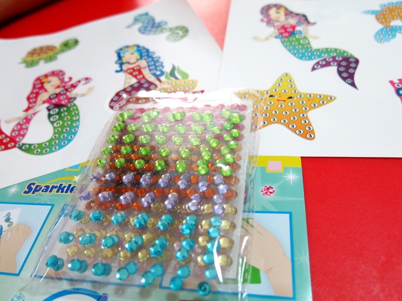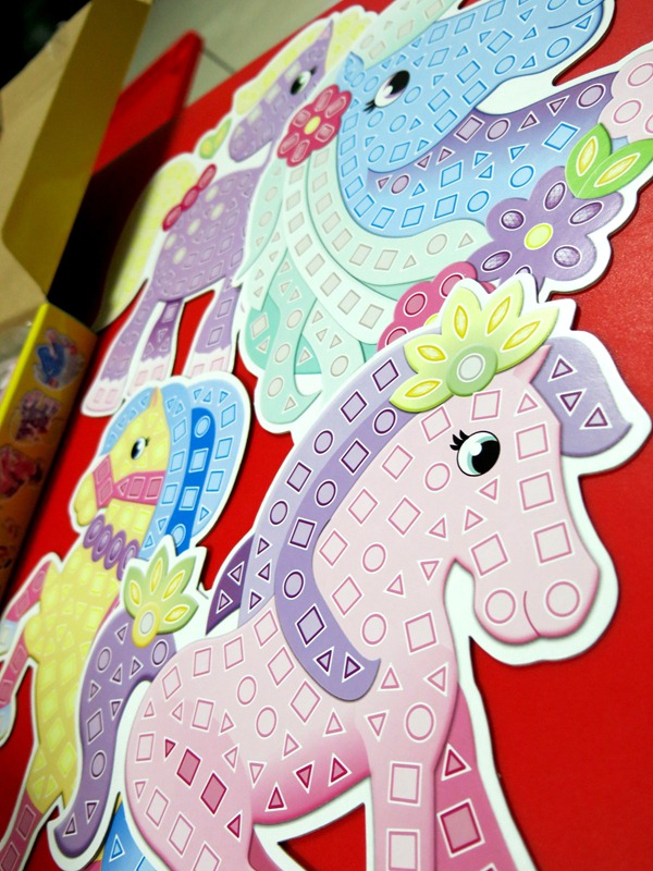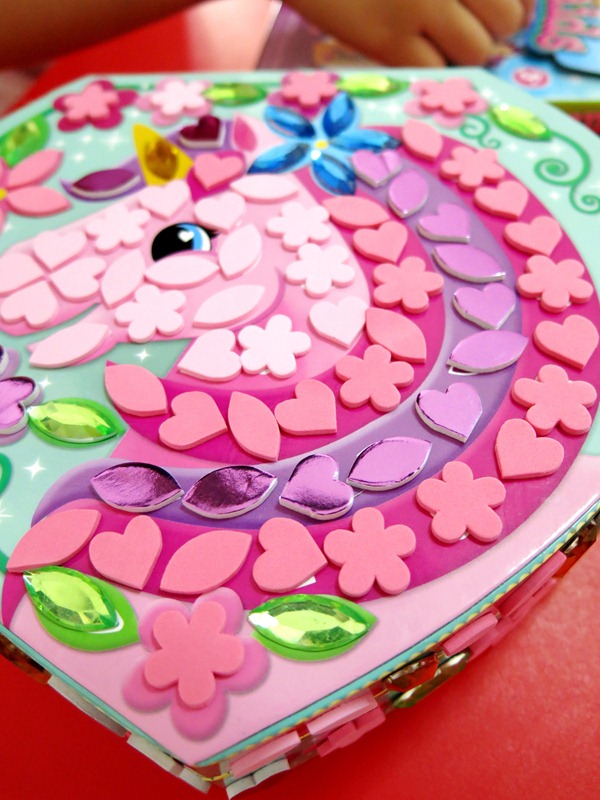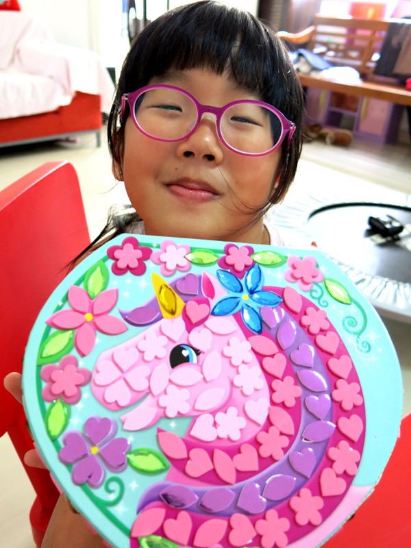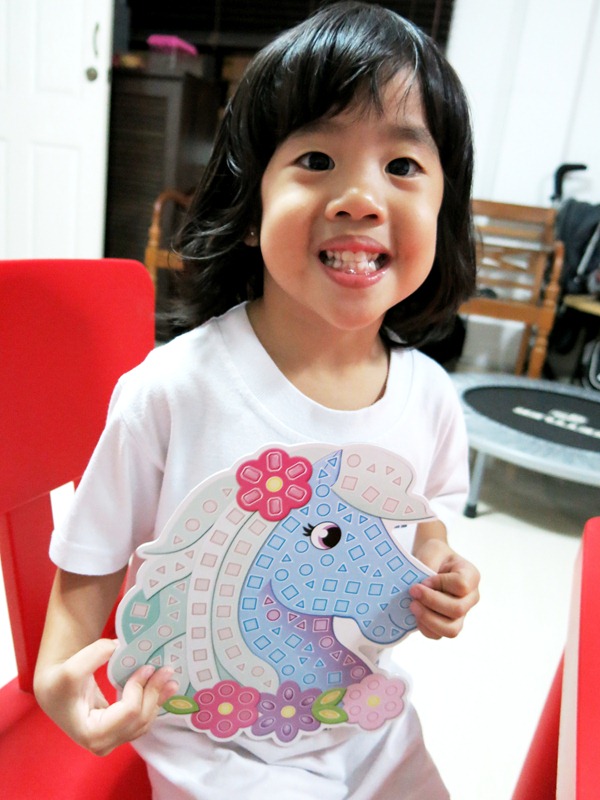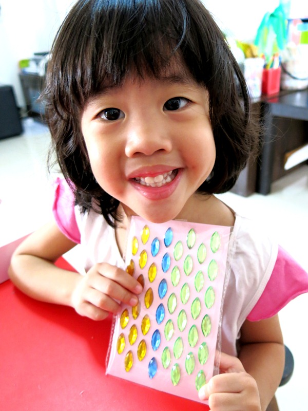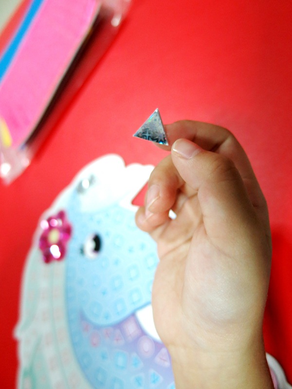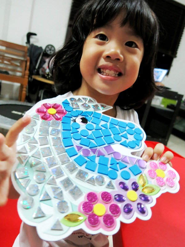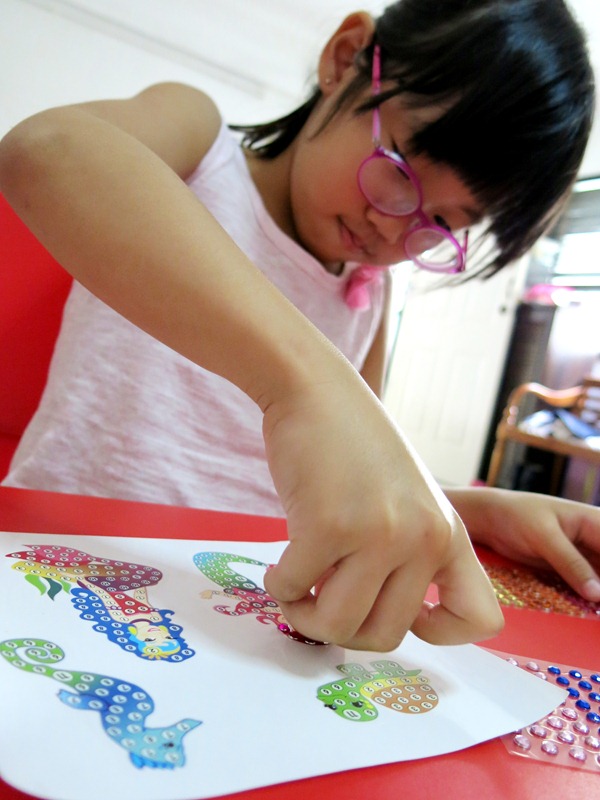 All kinds of crystals and foam mosaics are provided, and the kid can easily follow the colour and shape on the boards to stick them on. Easy peasy lemon squeezy. =D