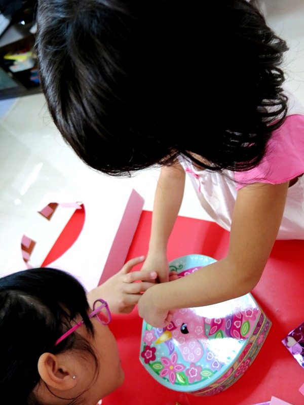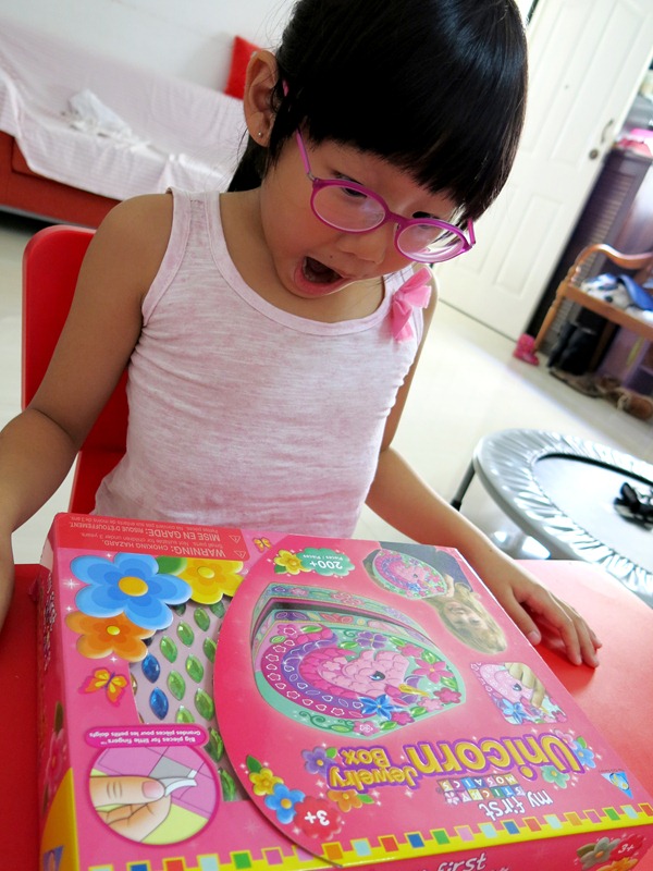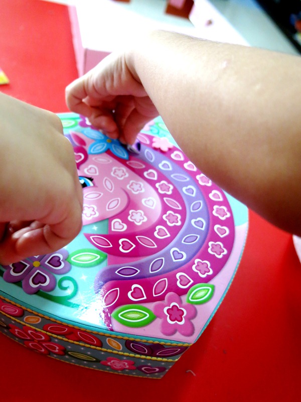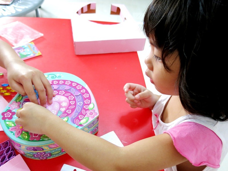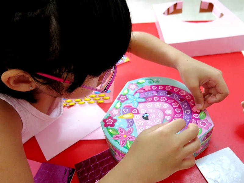 The project was really simple - Just paste the stickers onto the box according to the colour and shape, and at the end, you'll get a beautifully-decorated jewellery box to store all your earrings, bracelets etc. Fun and useful!