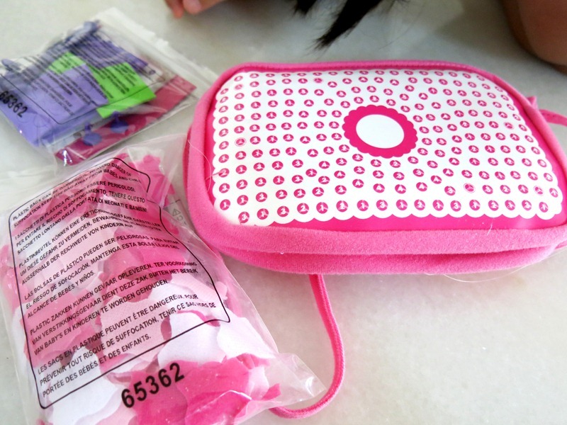 Follow the simple instructions to push every cloth shaving into the different holes in the purse. Every hole has a different number, indicating which coloured cloth shaving to use. Follow it, and a nice pattern will form.