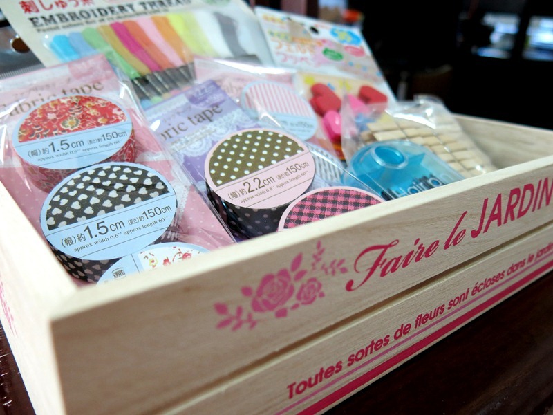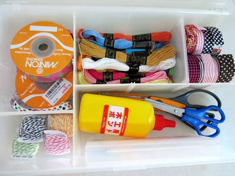 Do you like my craft box? =D There're my favourite fabric tape, ribbons, twines, glue, scissors all in one place neatly compartmentalised... Lovely!