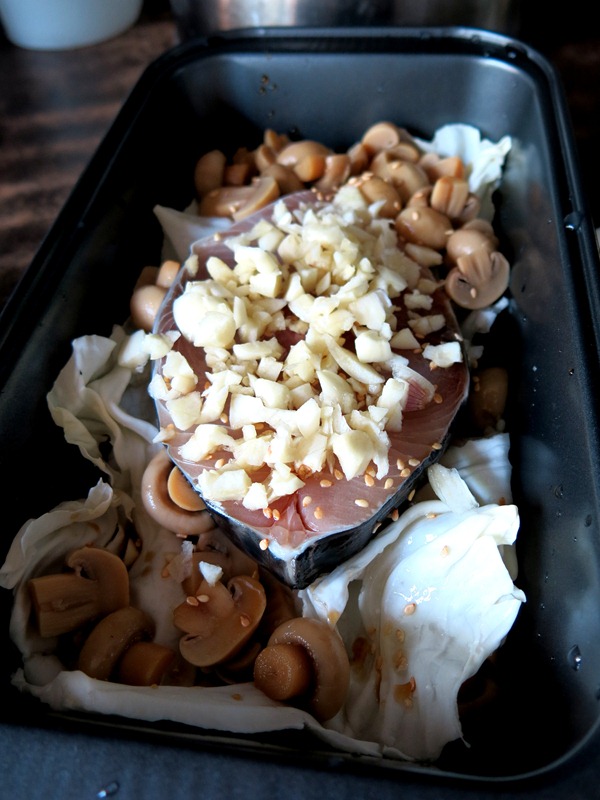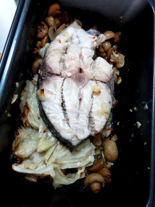 Those silicon trays and this metal tray are from Daiso, by the way. My baked fish is very simple - Just lay a bed of cabbage, place fish on it, drizzle soya sauce, sesame oil, chopped garlic and ginger, and I added in my kids' favourite button mushrooms.