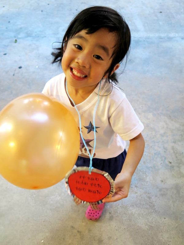 But it was not quite the same when it was my turn to join her for the game. =P She had to step on my feet and we were to hold a balloon between the two of us and I had to walk (with her feet on mine) to the finishing line. We finished last. Don't ask me why. =X