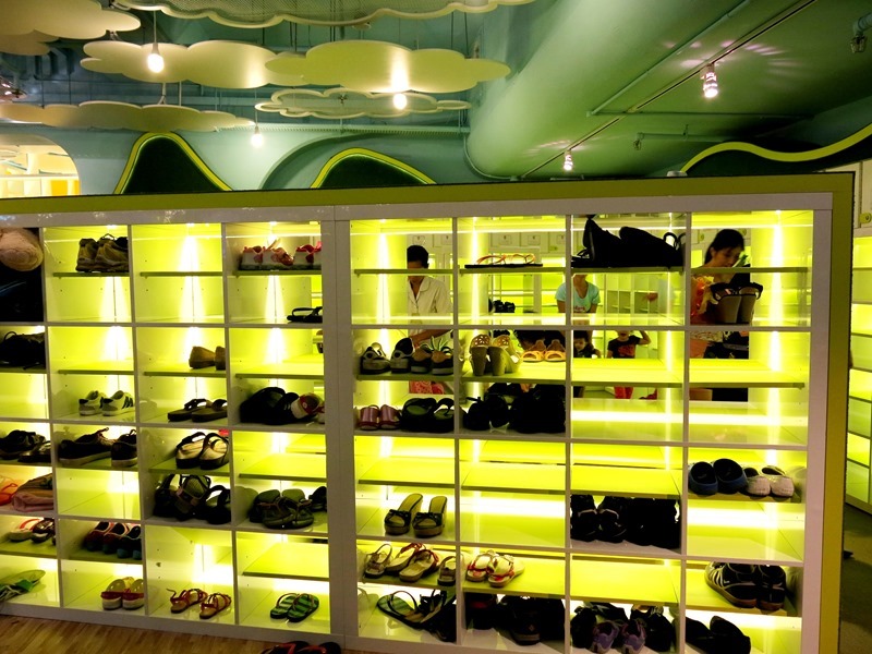 The shoe cabinets are huge and lit up prettily, with ample seats for the customers to take off and put on their shoes and socks. Love it!