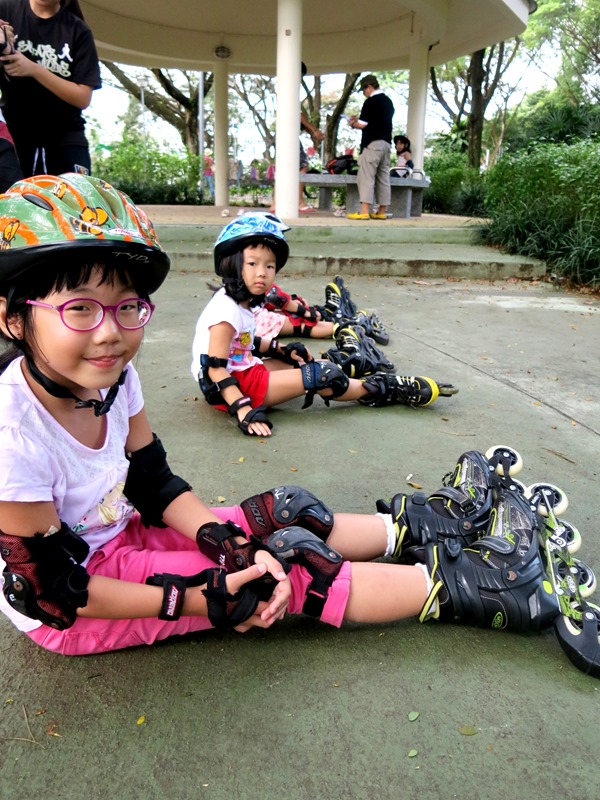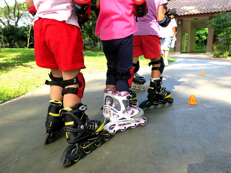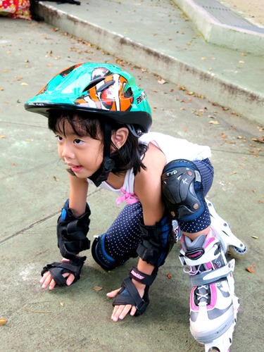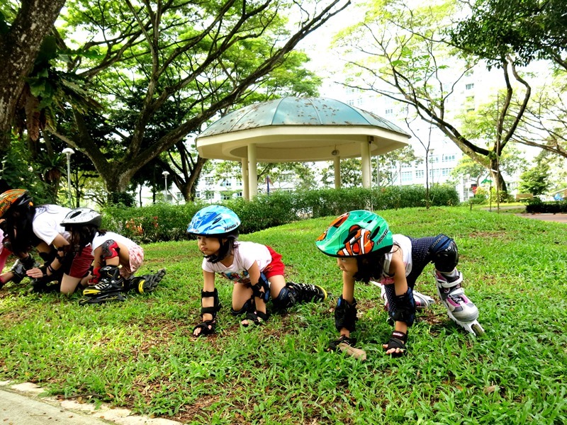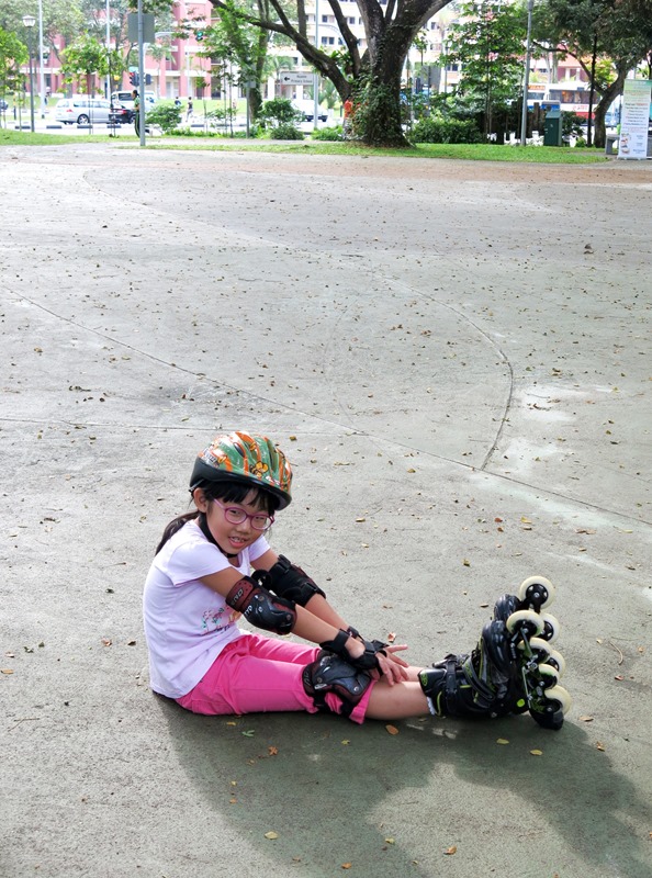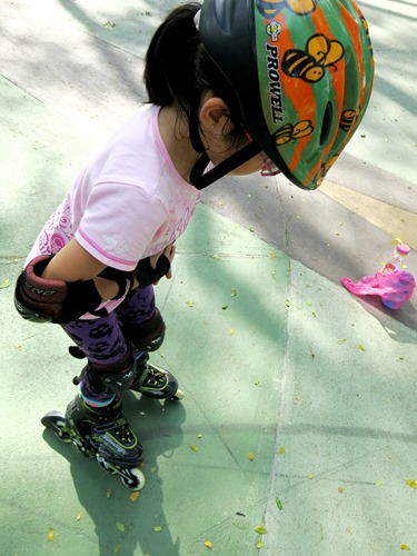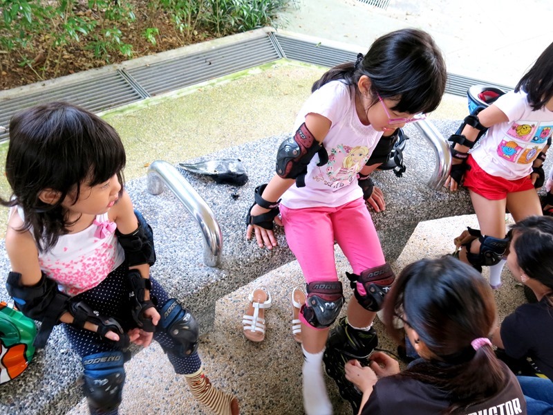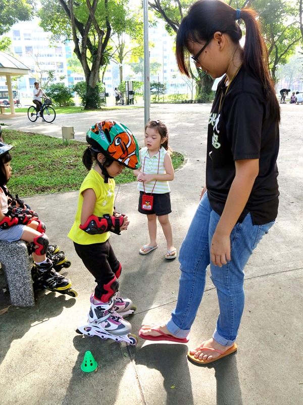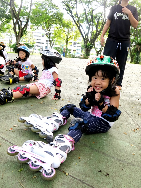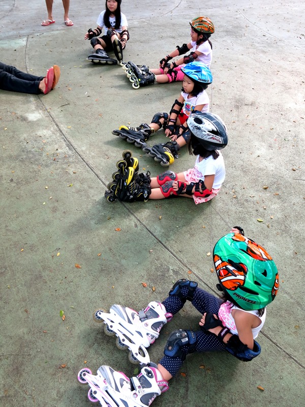 These are some snapshots of what they went through in the four mornings. From sitting position to standing position, then to stepping forward, learning how to fall in the correct posture, pushing forward in straight lines and then making a T-stop. The older girls also learnt how to open and close up as they were skating or making a slight turn.