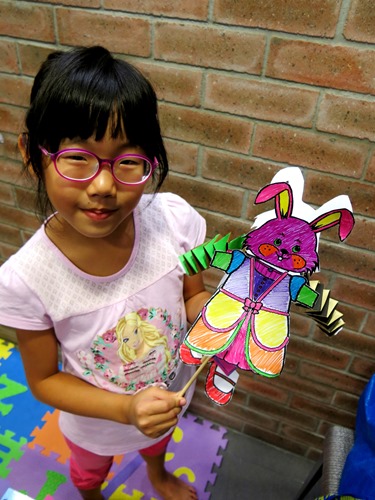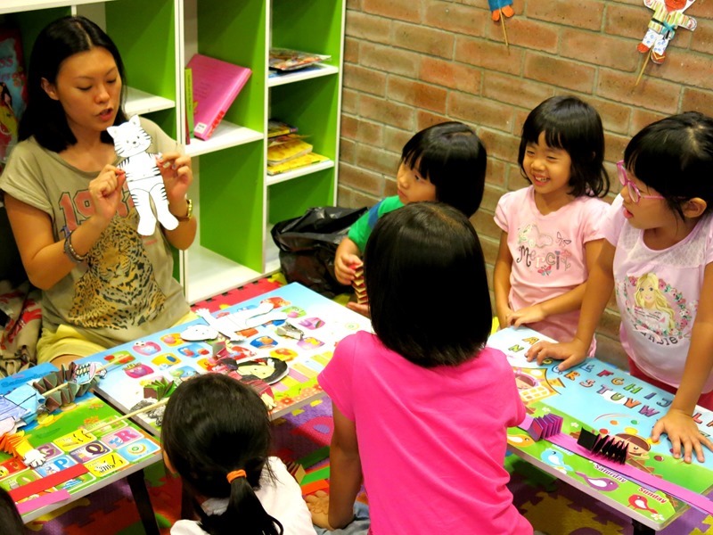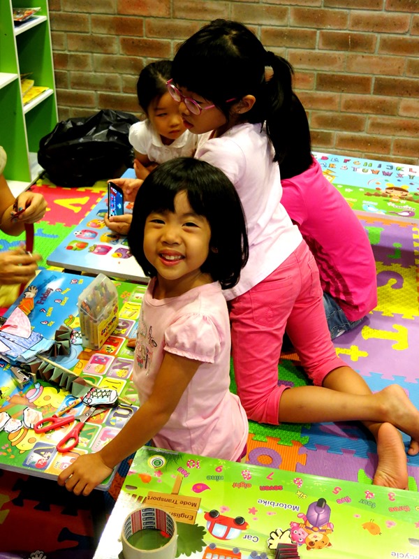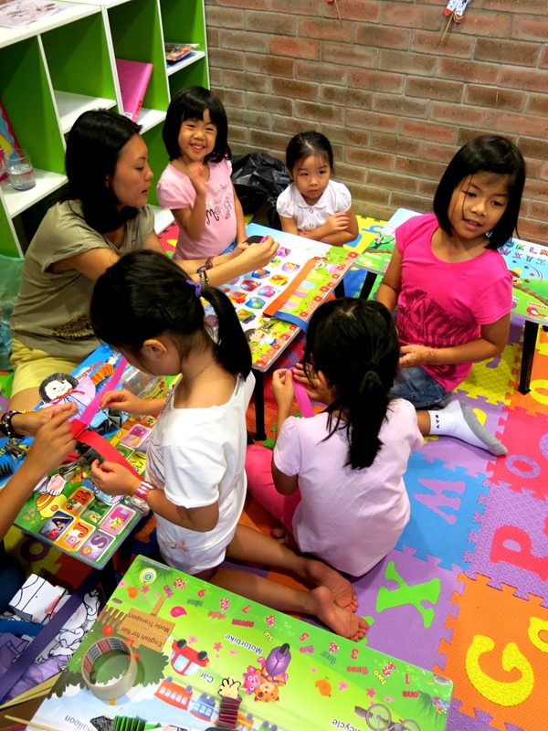 The teacher arrived and started the class with 6 kids. She started off with a short story-telling session before teaching the kids how to make their puppets, which are related to the characters in her story. The kids were very entertained!
