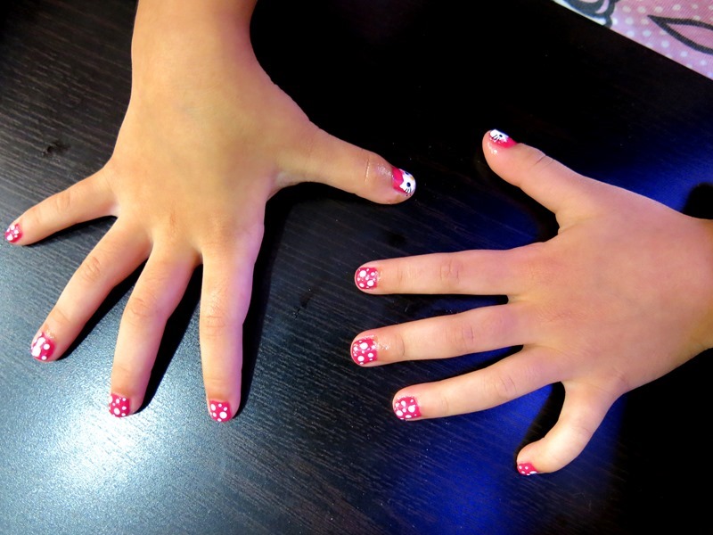 Jayne's toenails became pink with white polka dots, and her fingernails had hello kitty too (the girl insisted after seeing her sister's pretty nails!)