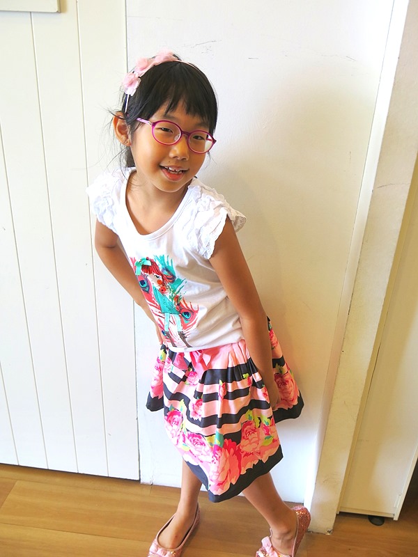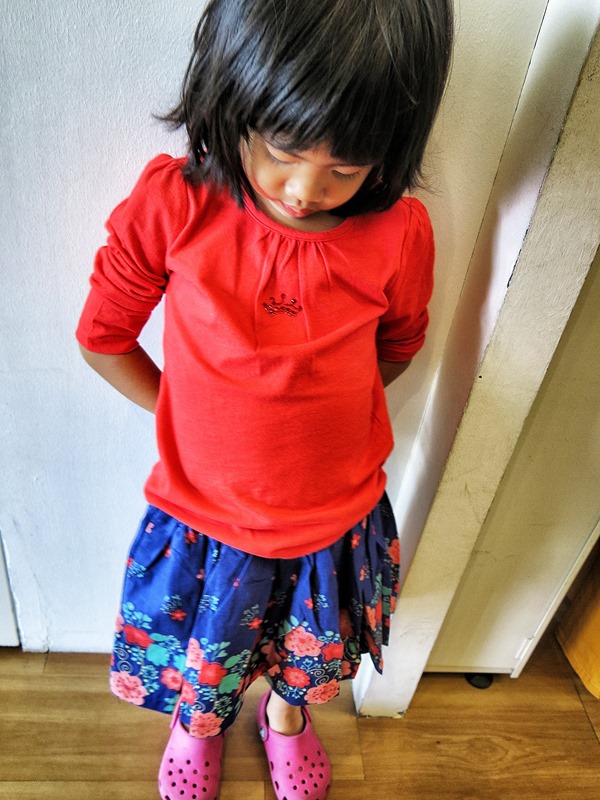 Another blue floral skirt, this time round for the younger sister. The red long-sleeved top was very soft and comfortable to wear.