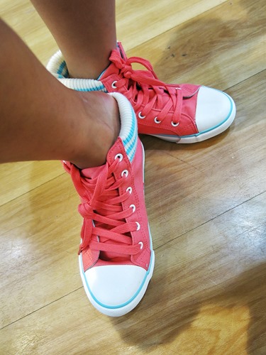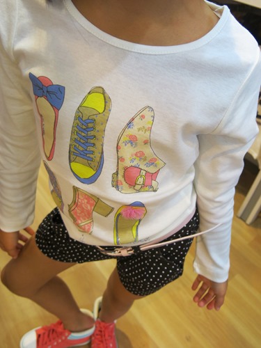 And doesn't this look fit her so very sporty personality? Polka dotted shorts with a long sleeved white tee, matched with a pair of pink sneakers. Love it!