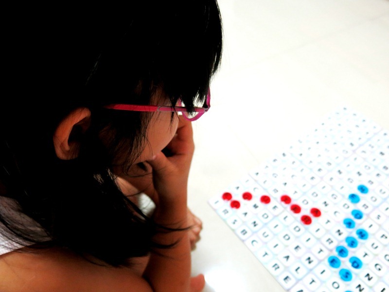 I have to say I am mightily impressed with Joey. She may not be able to spell many of the words, but she can see the alphabets available and guess that it can form a certain word. Then she checks with me on the spelling of the word she has in mind and most of the time, they can really be formed on the board! I think she might have a hidden talent for unscrambling words from random alphabets provided. The red chips are Joey's and mine's blue. You can see she was just one step behind me in the game! In fact, we played the game several times and she won me in some of them. *ashamed & proud all at the same time*