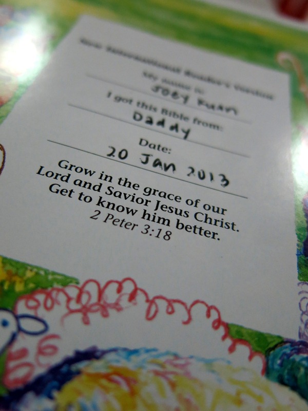 In my church, the kids are told to bring along their bibles for Children's Church once they turn 7 years old. So Papa Isaiah went to buy a bible for Joey, and in my opinion, it's probably going to be the best gift he can ever give to Joey. It is a gift that will guide her entire life. :)