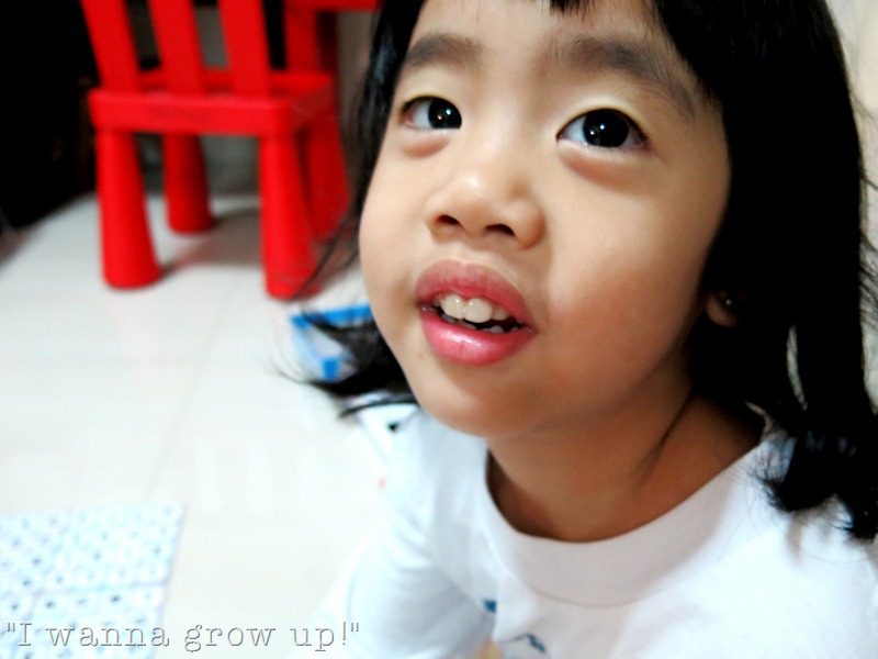 Check out Joey's LONG fringe - She refused to cut it off no matter how many times I've nagged at her. So she's been going to school with hair clips to put the fringe up everyday. It's funny to me because I remembered keeping my fringe long during my Secondary School days too. Even though the process of keeping it long enough in order to tie it up was tough, I persevered and 20 years down the road, I've still kept that long fringe and never once have I cut it short before! =P