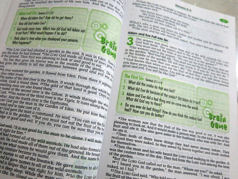 At various sections of the bible, there are also prompt questions inserted to aid the child in thinking deeper into the stories and verses. I was initially a little worried that a study bible would be too complicated for a kid just starting out, but the questions are catered to the level of the kid. It also provides a good platform for us to have a bible discussion with Joey - Such a great idea.