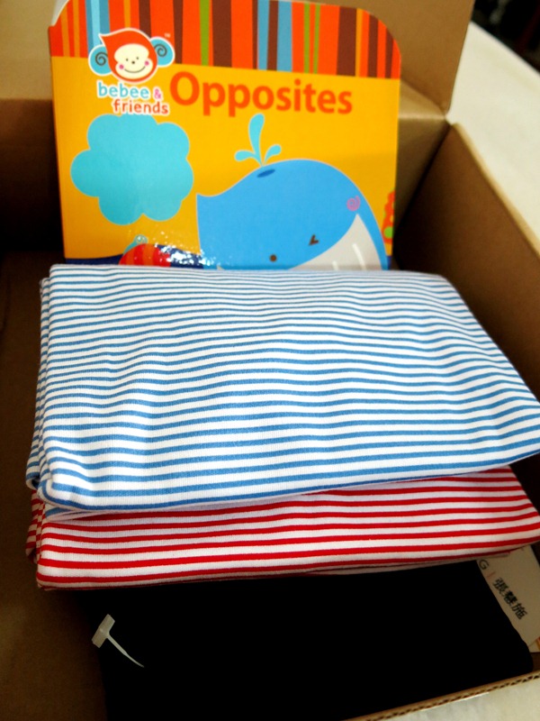 Inside Jayne's Peekabox was 2 striped tees, a black tights pants and a hardcover book on 'Opposites'. I have to say that the clothes were of superb quality. They were soft to the touch and very comfortable when worn.